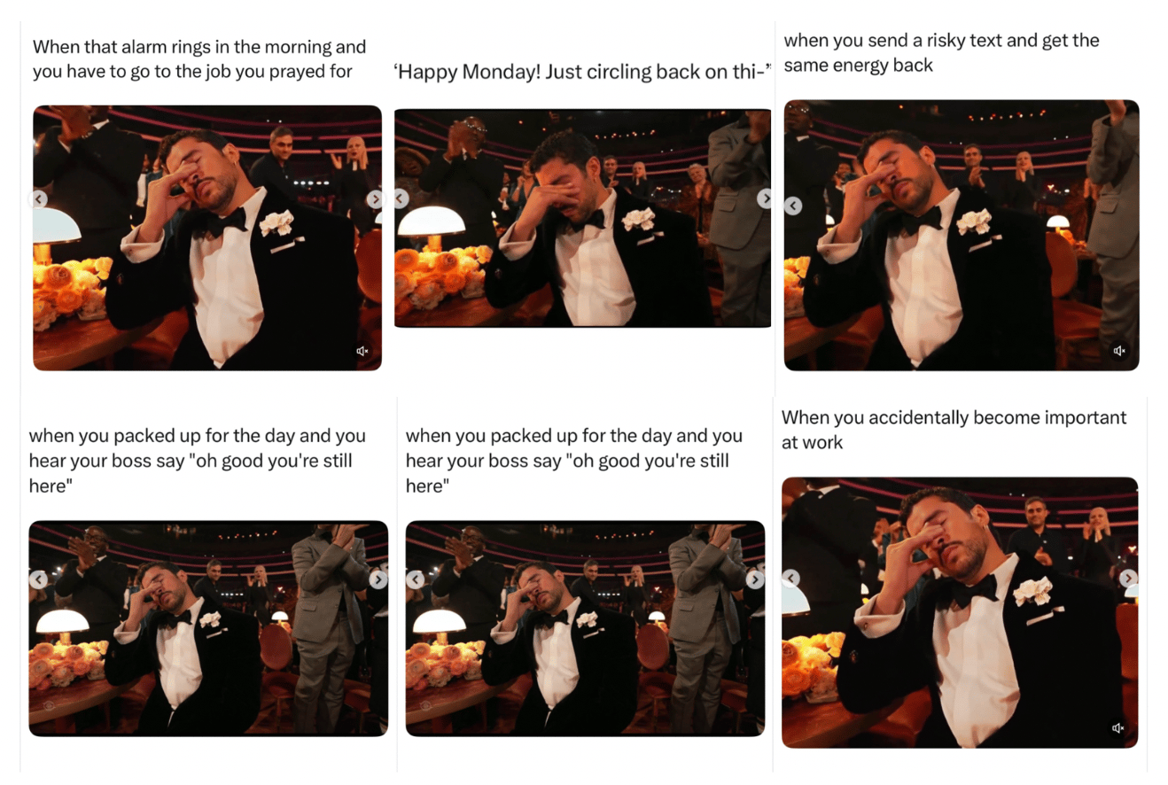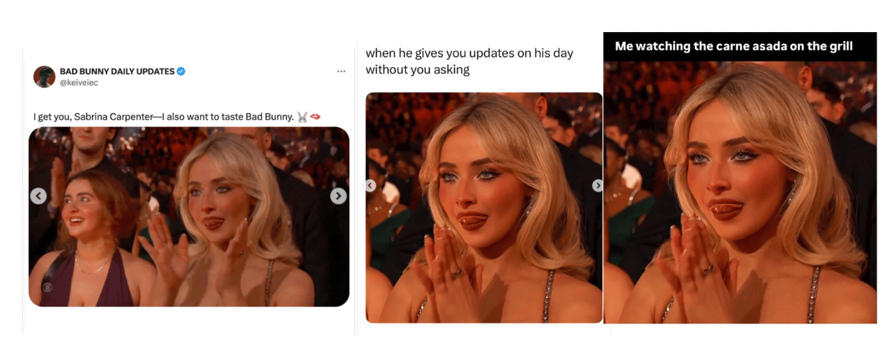 Emotion: The moment’s virality hinges on the over-the-top facial expression caught on camera — seen almost next to Bad Bunny’s historic win — which meme makers interpret as anything from intense focus to dramatic craving. Its ambiguous vibe makes it perfect for remixing into wildly different jokes and relatable reactions.