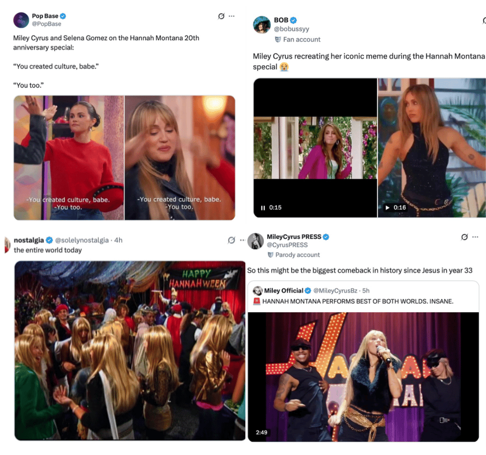 Emotion: The virality is driven by nostalgia, emotional connection, and “childhood unlocked” energy. Fans who grew up watching Hannah Montana are reliving core memories, while younger audiences are discovering the show’s impact, creating a mix of heartfelt tributes and playful memes about growing up.