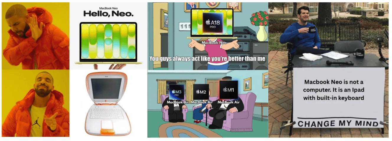 Emotion: The reaction online blends surprise, curiosity, and playful skepticism. Some users celebrate finally having a “budget Mac,” while others joke about the trade-offs (8 GB RAM, limited ports, missing premium features). The internet quickly turned the release into memes about Apple entering its “student laptop era” or “the MacBook for when you just need Safari and vibes.